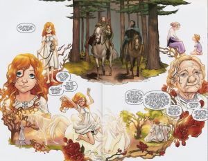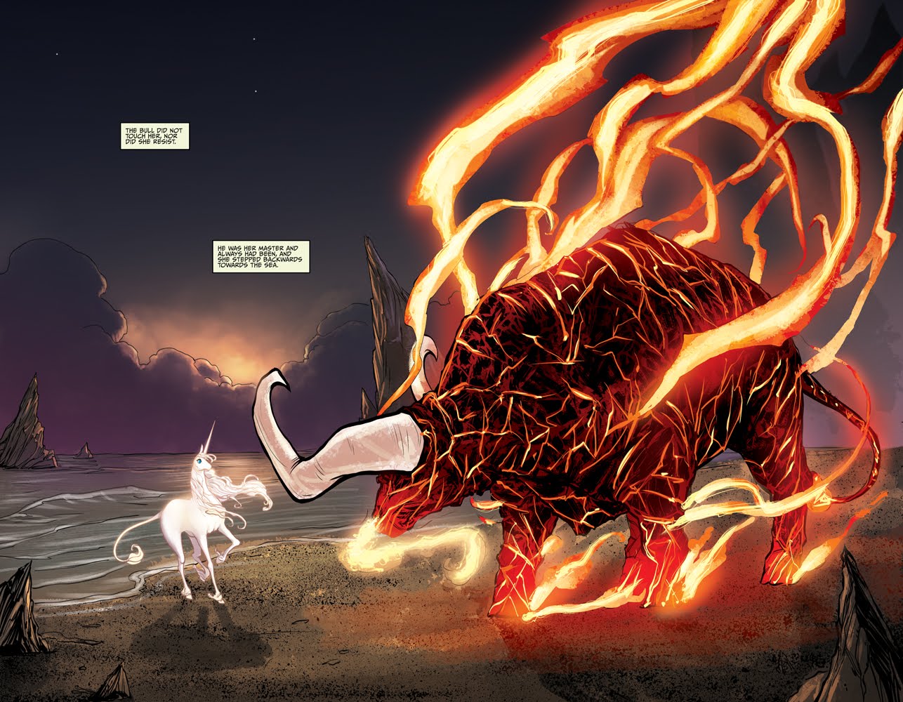 Along the way to find the other unicorns, we meet Molly Grue, a character who the author did not provide much background for, but was brought to life so beautiful by Tammy Grimmes in the movie that Peter Beagle was grateful to her. She is my favorite human character and reading her words in the graphic novel I was immediately reminded of the movie. Eventually, the trio makes it to the castle of King Haggard, who with the help of the Red Bull has driven the rest of the unicorns into the sea where they wait to return to the land.