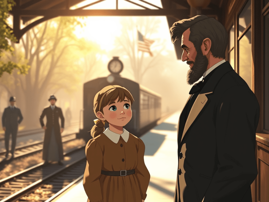 But a month later, whiskers began to appear. On February 16th, 1861, President-elect Lincoln stopped in Westfield, New York, on his way to Washington—bearded and curious. Stepping off the train, he asked if the young lady who had written to him was present. A small boy perched on a lamp post shouted, “There she is, Mr. Lincoln!” and Grace stepped forward, blushing as she met the man whose face now matched her suggestion. The meeting was brief, sweet, and human.